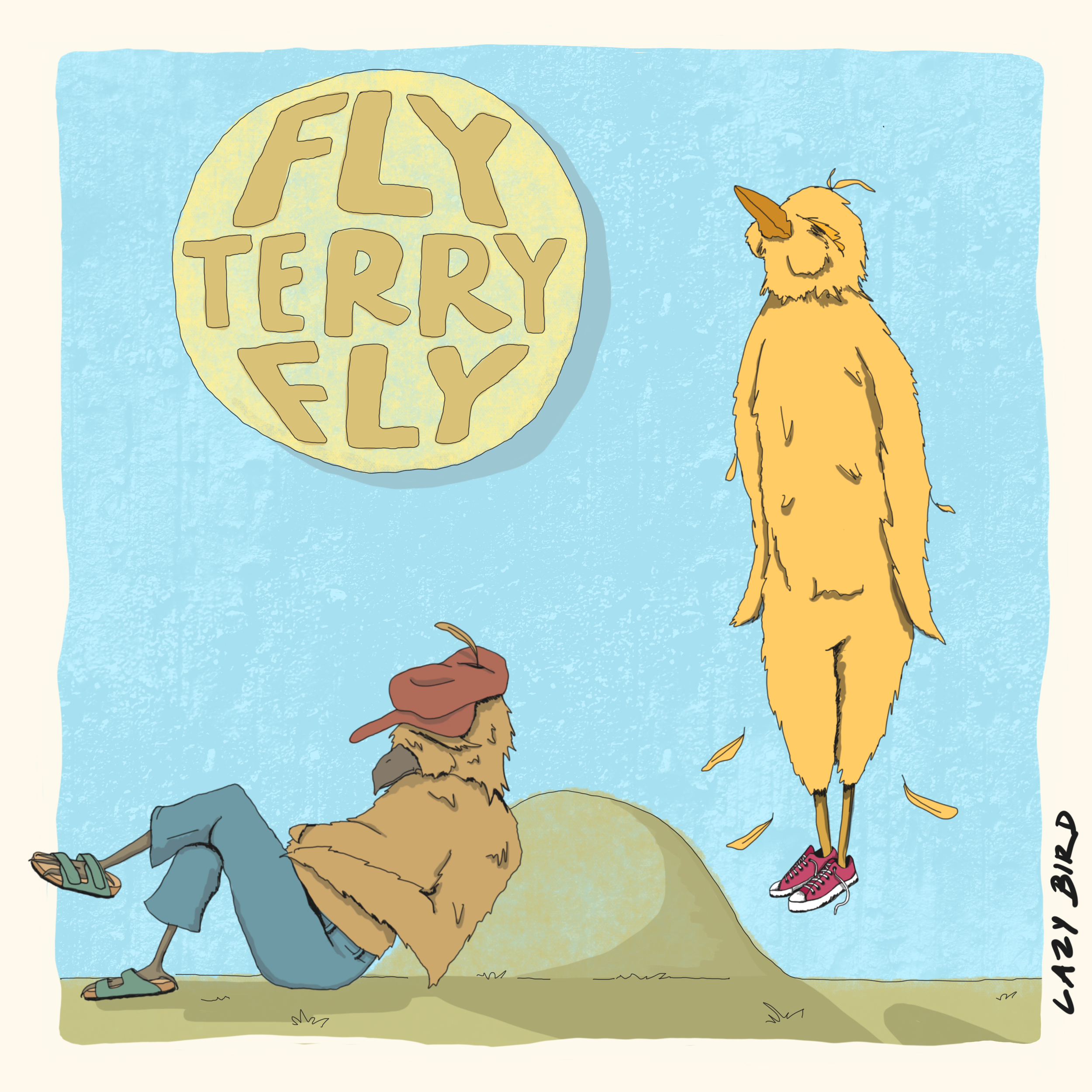 Cover art for their single ‘Fly Terry Fly’ released in 2023. Artwork displays two birds exhibiting human-like states of being, one of whom is attempting to fly while the other leisurely sits on the ground.
